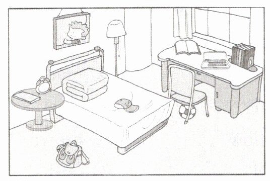 假设下图是你的房间。请根据图片提示,描述一下你房间中物品的位置。不少于 40 词。开头和结尾已给出,不计入总词数。