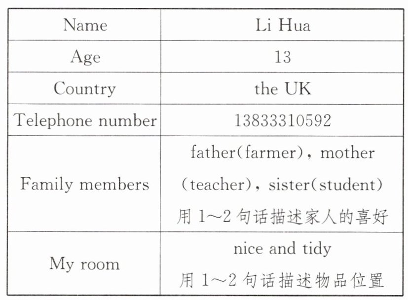 Hello! I am Li Hua. I am 13 years old and I come from the UK. My telephone number is 13833310592. There are four people in my family: my father, my mother, my sister and me. My father is a farmer and he loves gardening. My mother is a teacher and she enjoys reading books. My sister is a student who likes playing the piano. I have a nice and tidy room. There is a bed near the window, and a desk with a computer on it.