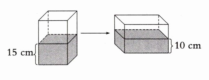 5. 如图,有一个密闭的长方体容器,长和宽都是 20 cm,里面装着一些水,水的高度是 15 cm。如果将容器向右翻转,呈右下图所示水平放置,现在水的高度是 10 cm。根据这些信息,求这个容器的体积。(容器厚度忽略不计)