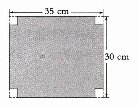 4. 一块长 35 cm、宽 30 cm 的铁皮,从四个角各切掉一个边长为 3 cm 的正方形,然后做成一个无盖的盒子,制作这个铁盒用了多少铁皮?它的容积是多少?(铁皮厚度忽略不计)