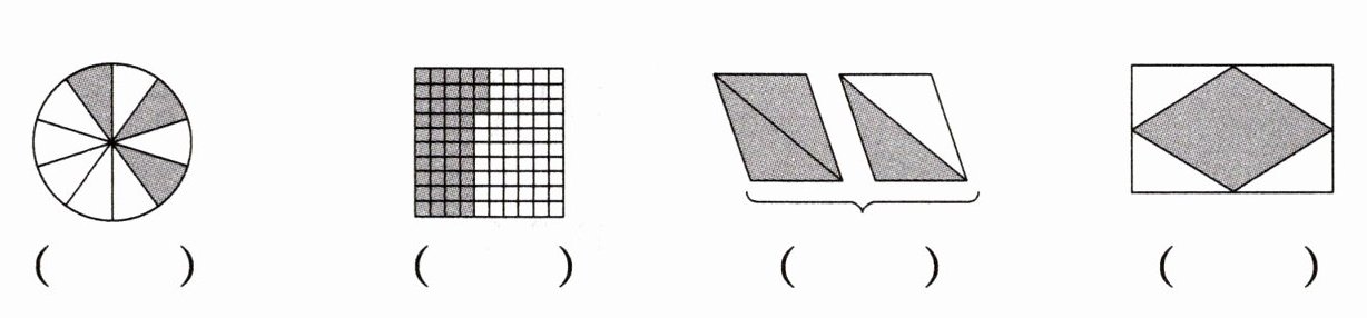 1. 把一个图形看作单位“1”,用分数表示各图中涂色部分的大小。