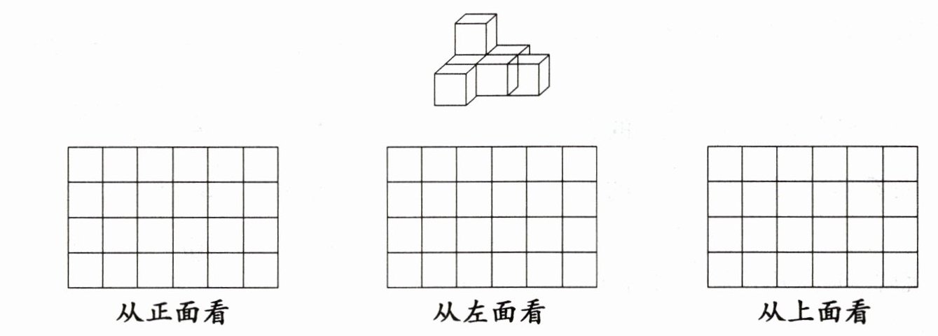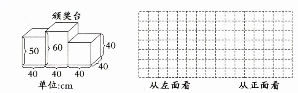 2. 在方格中分别画出从左面和正面观察颁奖台时所看到的图形。(每个小方格的边长代表20cm)