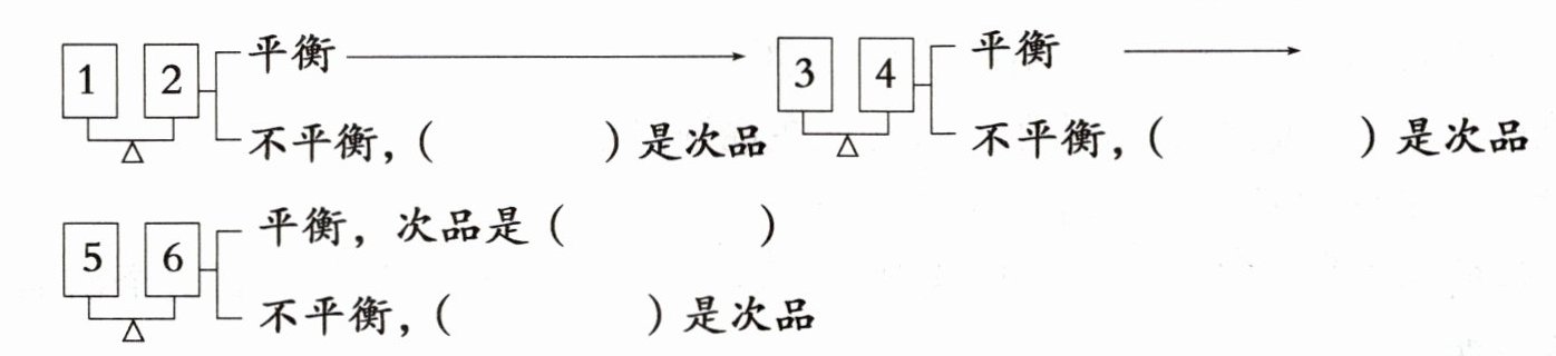 3. 有7个零件,其中6个质量相同,1个是次品(轻一些),请你用天平找出它。