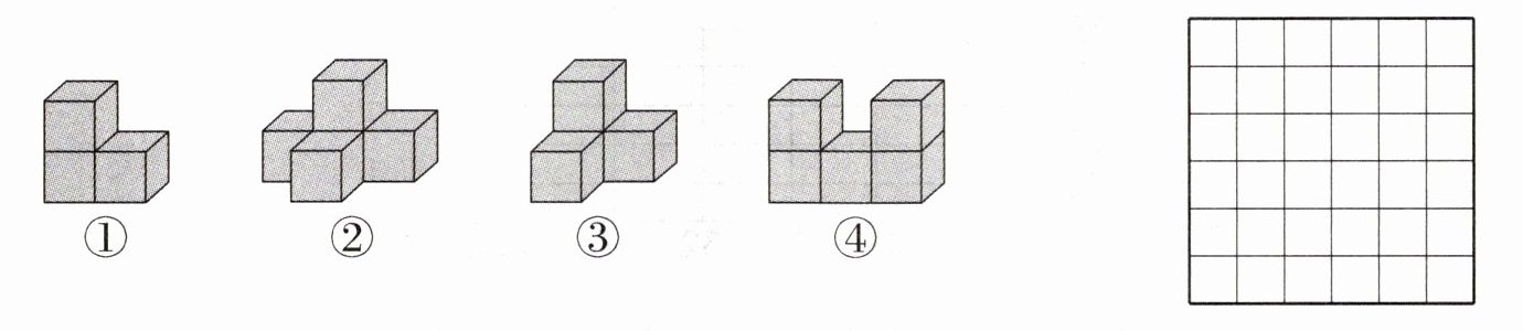 (2)在上面的方格纸中画出图形③从上面看到的图形,标上图(1);画出图(1)绕左上角的顶点逆时针旋转$90^{\circ}$后的图形,标上图(2)。