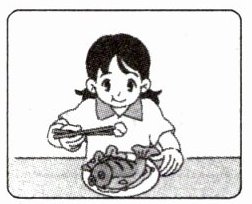 ()1. She smells the fish with her nose.