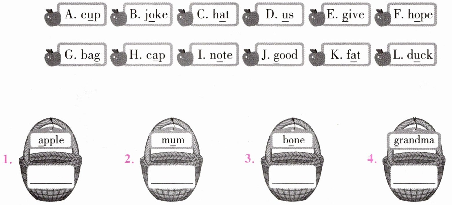 二、根据画线部分发音,把苹果放入对应的篮子里。