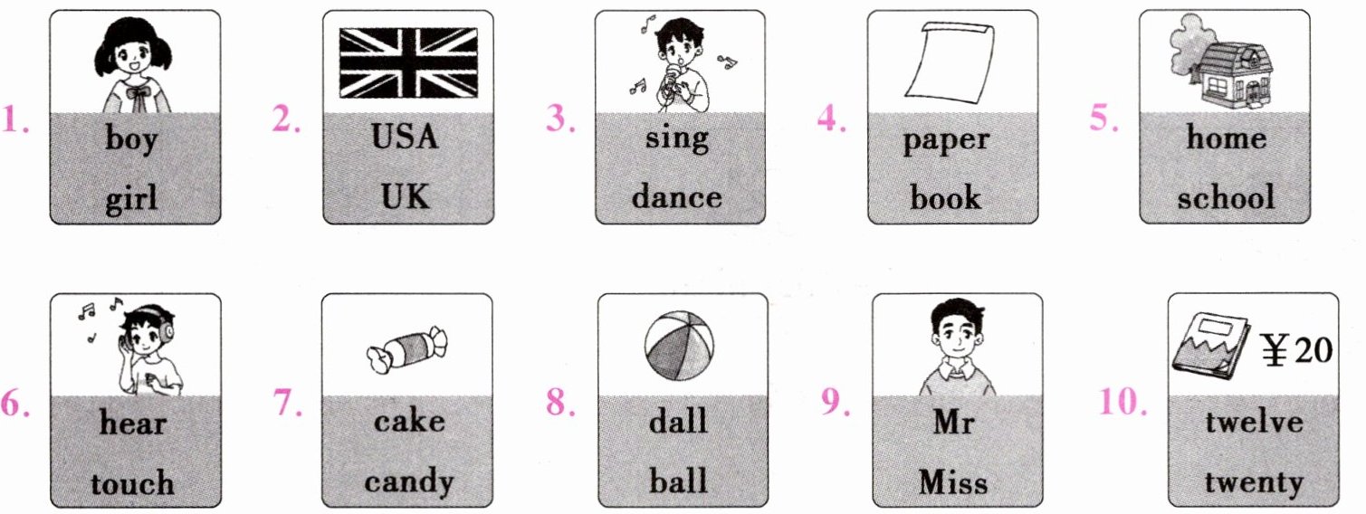 二、选出每组单词中不同类的单词,将序号写在括号内。