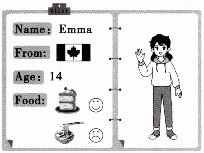 Hello, my name is Emma. I’m from (China/Canada). I’m (fourteen/nineteen) years old. I’m (thin/fat) and tall. I like(bread/cake). I don’t like(noodles/rice).