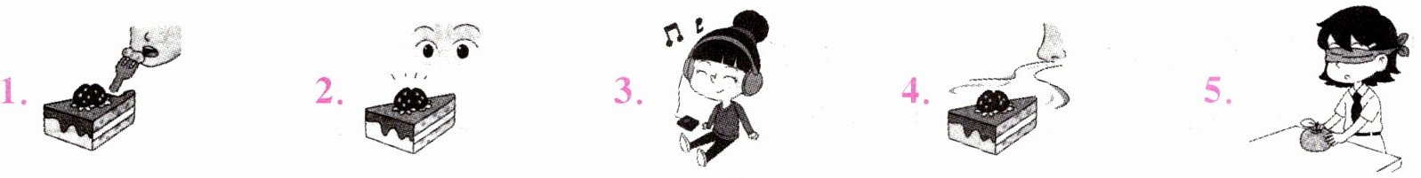 1. taste 2. see 3. hear 4. smell 5. touch