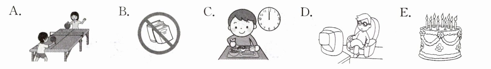 ()5. What do you often do on the weekend? E. He’s listening to music.