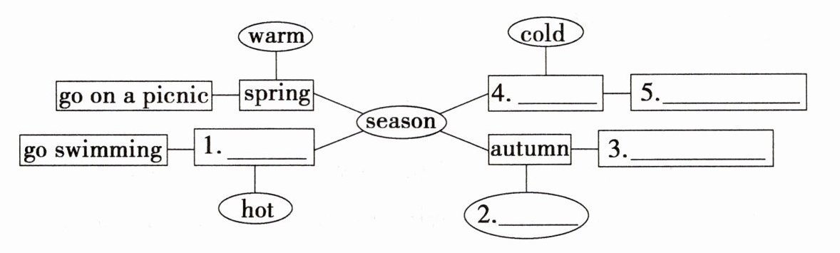There are four seasons in a year. They are spring, summer, autumn and winter. Spring is warm. We often go on a picnic. In summer, it's hot. We often go swimming in the sea. It's cool in autumn. It's golden and farmers are busy. We can pick apples in autumn. Winter is cold. In winter, it sometimes snows. We can make a snowman.