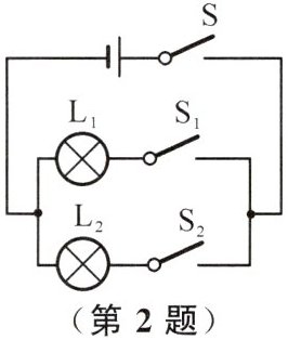 2. 在如图所示的电路中,两个灯泡的连接方式是______(选填“串”或“并”)联。若只要灯$L_1$发光,应闭合开关______;若只要灯$L_2$发光,应闭合开关______;若要使灯$L_1、$$L_2$同时发光,应闭合开关______。