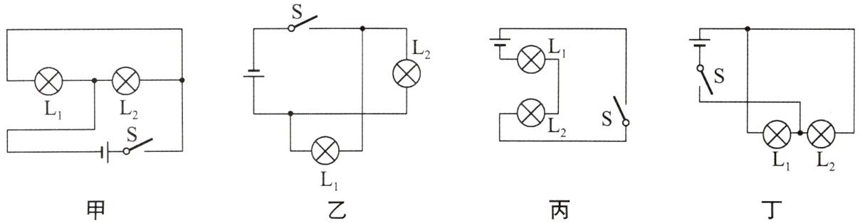 C 解析:题图甲、乙、丁中,开关闭合后,电路均有两条电流路径,分别经过两个灯泡,两个灯泡都发光,所以属于并联电路.
