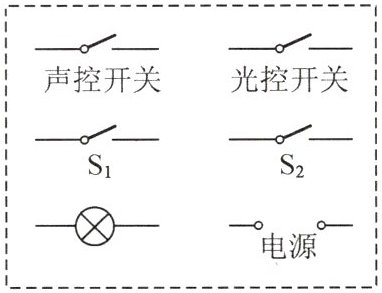 20. 小明受楼道灯电路的启发,在爷爷的卧室里安装了一个“聪明”的电路。晚上只要拍拍手,灯就亮了,过一会儿自动熄灭,给爷爷的生活带来了方便;不过遇到晚上有雷雨的情况就麻烦了,雷声使灯不断被点亮,影响爷爷休息。另外爷爷睡觉前需要这盏灯一直被点亮。现在给你两个开关$S_1、$$S_2,$在虚线框中完成对这个“聪明”电路的设计,并分别说明在灯自动工作、晚上打雷取消自动功能和需要灯一直被点亮时,开关$S_1、$$S_2$的断开与闭合情况。