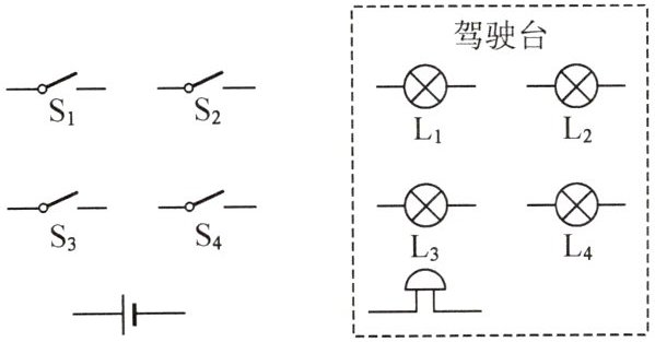 19. 小轿车一般有四个车门,为防止行驶时车门没关好带来危险,有些车设计了报警电路。四个车门都关闭时电铃不响且指示灯都不亮;只要有一个车门没有关闭,电铃就会报警,对应的指示灯($S_{1}对应L_{1}$,其他类推)就会发光,根据指示灯发光情况可判断哪一个车门没有关闭。请你在图中将各元件连接,设计出符合要求的电路图。(说明:每个车门控制一个开关,当车门关闭时开关断开,车门打开时开关闭合)