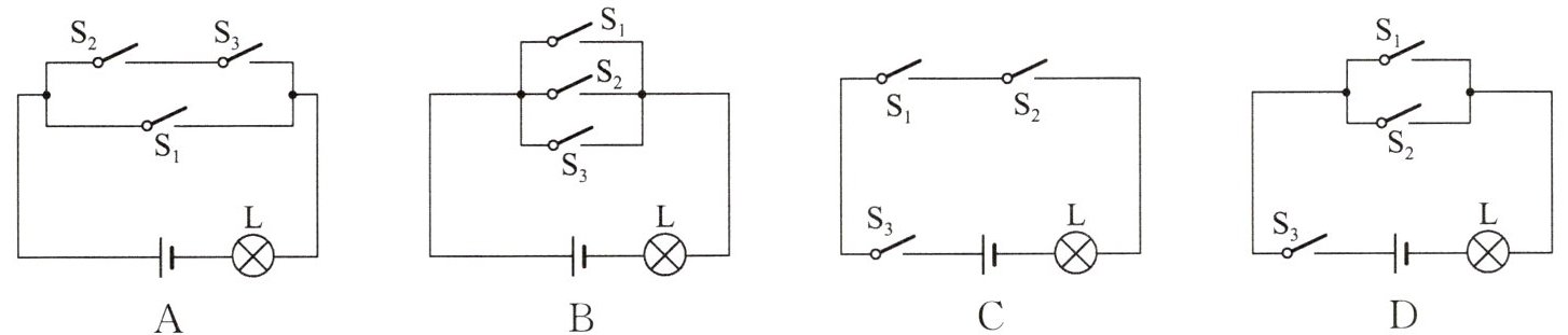 D 解析:由题意可知,指纹开关$S_{1}$或密码开关$S_{2}$均可以解锁手机,锁定开关$S_{3}$断开时暂停手机解锁功能,则指纹开关$S_{1}$和密码开关$S_{2}$可以独立工作、互不影响,是并联连接的,且锁定开关$S_{3}$和灯泡均位于干路上,结合电路图可知,D符合题意。