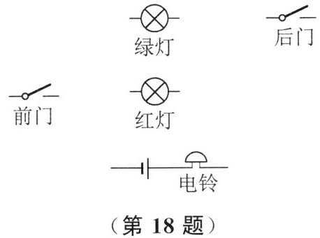 18. 学习了电路相关知识后,小明想给自家的养殖场设计一种呼叫装置,要求前、后门来的客人均可呼叫。前门来的客人闭合开关,办公室的电铃响、红灯亮;后门来的客人闭合开关,办公室的电铃响、绿灯亮。请帮助他画出符合要求的电路图(导线不得交叉)。