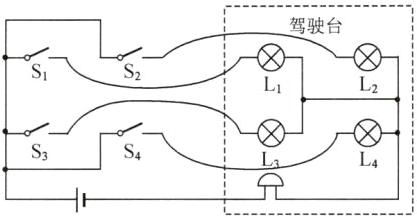 解析:由于只有四个车门都关闭时电铃不响且指示灯不亮,说明四个车门上的开关是并联的;只要有一个车门(相当于开关)未关好,电铃就会报警,说明只要一个开关处于闭合状态,电铃就会工作,且对应的指示灯就会发光,说明开关与对应的灯泡应串联,电铃在干路上。