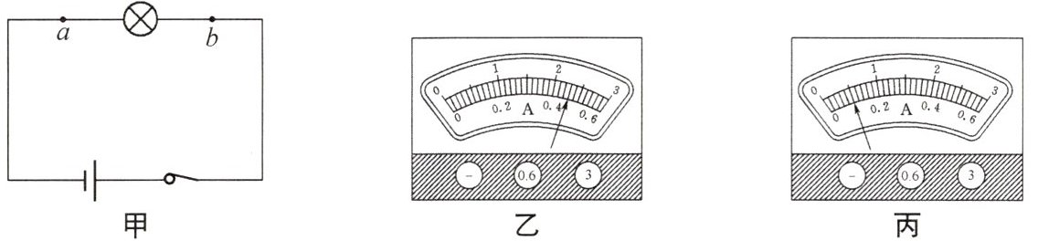 20. 小丽用有“0~0.6A”和“0~3A”两个量程的电流表探究如图甲所示的电路中通过a、b两点的电流的大小关系(电流大小相等).电流表接在a点时,指针位置如图乙所示;电流表接在b点时,指针位置如图丙所示.