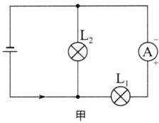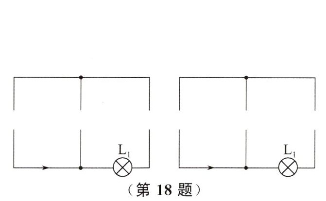 18. 请在图中分别将电源、电流表、灯$L_{2}$的电路元件符号填进电路的空缺处.要求:开关闭合后,灯$L_{1}$、$L_{2}$并联,电流方向如图所示,并在相应的图中标出电流表的正、负接线柱.(给出两种画法)