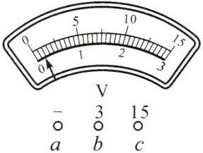 18. 小明同学用有“$0\sim 3V$”和“$0\sim 15V$”两个量程的电压表测电压时,电压表“$-$”接线柱已经接入电路,在用“$0\sim 15V$”量程试触时,指针位置如图所示,则下一步的实验操作应该是 ()