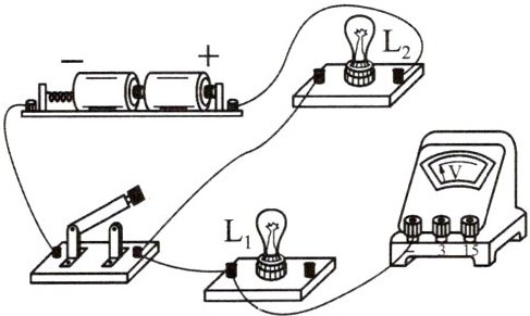 解析:探究并联电路中电压的规律,两灯应并联,电压表与待测用电器并联,电源电压为3V,故电压表选用小量程与灯 $ L_{1} $ 并联,如答图所示。