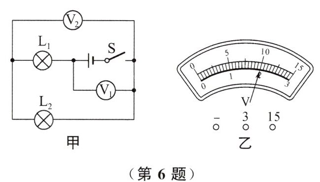 6. 如图甲所示的电路图中,S闭合后,两个电压表的指针偏转角度相同,如图乙所示.则$L_{1}和L_{2}$两端的电压分别是 ()