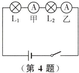 4. 在研究串联电路中电流的特点时,设计出如图所示的电路,实验时发现灯$L_{1}比L_{2}$亮一些,电流表甲和乙的示数分别为0.18A和0.14A,造成两个电流表示数不同的原因可能是 ()