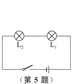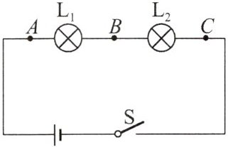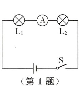 0.4 等于 解析:由题图可知,灯$L_{1}$、$L_{2}$串联,则通过两个灯泡的电流相等,电流表的示数为 0.4 A,所以通过$L_{1}$、$L_{2}$的电流均为 0.4 A.