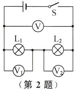 2. (2023·怀化)在如图所示的电路中,闭合开关后电压表$V_{1}$的示数为2.5V,电压表V的示数为4.5V,则电路的电源电压为____V,灯$L_{2}$两端电压为____V.