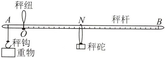D 解析:由杠杆平衡条件可知,$m_{秤砣}g×ON = m_{物}g×OA$,则 $ON = m_{物}×\frac{OA}{m_{秤砣}}$,因 $\frac{OA}{m_{秤砣}}$ 是一个定值,所以 $ON$ 与 $m_{物}$ 成正比,即秤杆上的刻度线分布是均匀的,A错误;由杠杆平衡条件可得,$m_{物}=m_{秤砣}×\frac{ON}{OA}$,所以减小秤砣质量可以减小杆秤的量程,B错误;称量时,若秤杆 $B$ 端向上翘起,说明右边的力和力臂的乘积小于左边的力和力臂的乘积,而左边的力和力臂以及右边的力一定,根据杠杆平衡条件可知,应该增大右边的力臂,即应将秤砣向 $B$ 端移动,C错误;秤砣沾有油污时,左边的力和力臂不变,右边的力偏大,根据杠杆的平衡条件可知,右边的力臂偏小,即杆秤所示的质量值要小于被测物的真实质量值,D正确。