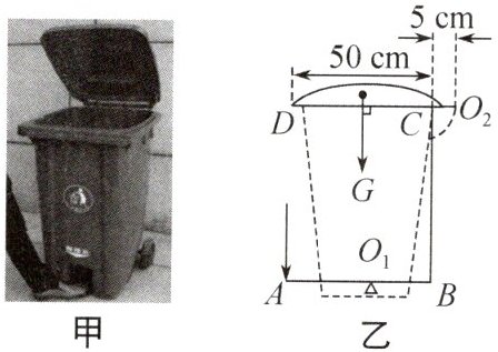 15. (2023·攀枝花)图甲是脚踏式翻盖垃圾桶的实物图,翻盖时应用了杠杆原理,图乙为组合在一起的杠杆$AO_{1}B$、$DCO_{2}$的示意图.已知桶盖重5N,重心位于DC中点的正上方,$AO_{1}= 30cm$,$O_{1}B= 20cm$,杠杆的相关尺寸如图乙所示,脚踏杆$AO_{1}B$和竖直连接杆BC的质量不计.