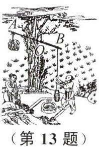 13. 如图所示是《天工开物》中记载的我国传统提水工具“桔槔”,用绳子系住一根直硬棒,O点作为支点,A端挂有重为40N的石块,B端挂有重为20N的空桶,OA长为1.2m,OB长为0.6m.使用时,人向下拉绳放下空桶,装满重为100N的水后向上拉绳缓慢将桶提起,硬棒质量忽略不计.下列说法正确的是 ()