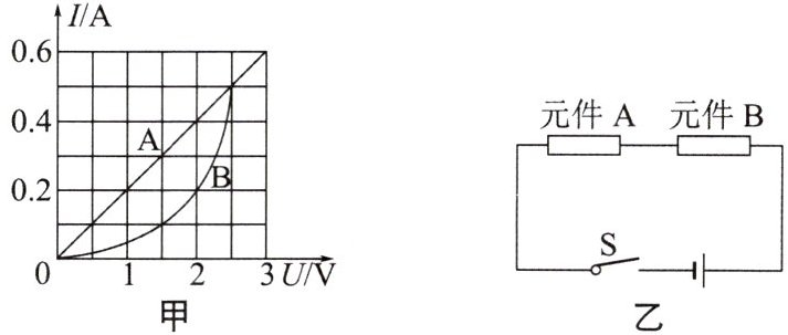 3 0.1 解析:由题图乙可知,电路元件 A 和 B 串联,串联电路中各处的电流相等,则通过 A、B 的电流均为 0.2 A,由题图甲可知,此时 A 和 B 两端的电压分别为$U_{A} = 1V$、$U_{B} = 2V$,串联电路两端的总电压等于各部分电路两端的电压之和,则电源电压$U = U_{A} + U_{B} = 1V + 2V = 3V$;若电源电压为 2 V,则由题图甲可以看出,电流为 0.1 A 时,A 和 B 两端的电压之和为 2 V.