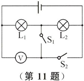 11. 如图所示,电源电压保持不变,当开关$S_{1}$闭合、$S_{2}$断开时,电压表的示数是3V;当开关$S_{1}$断开、$S_{2}$闭合时,电压表的示数是4.5V,则灯$L_{1}$、$L_{2}$两端的电压分别为____V和____V.