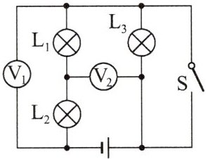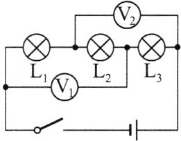 16. 在如图所示的电路中,闭合开关,电压表$V_{1}$的示数是6V,电压表$V_{2}$的示数为9V.若$L_{3}两端电压是L_{1}$两端电压的两倍,则电源电压是 ()