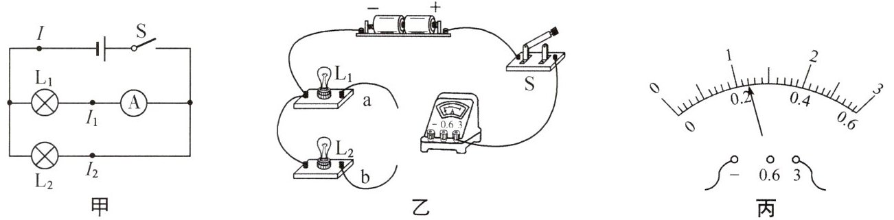 (4)干路中的电流如图丙所示,可读出I = ______A.接着他又测出通过灯$L_2$的电流为$I_2,$就想根据这组数据分析得出结论,但同组的小华认为该实验还没有结束,他在表格中记录数据后,接下来的具体操作是______.