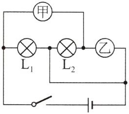 A 解析:若甲是电流表,乙是电压表,灯泡$L_{1}$和$L_{2}$并联,两灯发光,电流表测通过$L_{2}$的电流,电压表测电源电压;若甲是电压表,乙是电流表,导线会将灯泡$L_{2}$短路,$L_{2}$不发光;若甲、乙都是电流表,则$L_{1}$和$L_{2}$都被短路,都不能正常发光;若甲和乙都是电压表,灯泡$L_{2}$中无电流通过,$L_{2}$不发光.A正确.