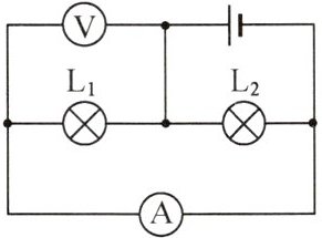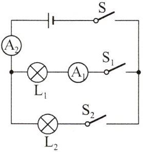 (2)小明先将电流表接在灯$L_1$所在的支路上,闭合开关后,看到灯$L_2$发光,但灯$L_1$不发光,电流表的示数为零,电路可能存在的故障是______.