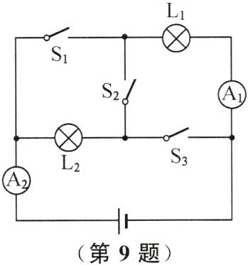 (2)闭合开关$S_{1}$和$S_{3}$时,两灯并联,电流表$A_{1}$测通过$L_{1}$的电流,故通过灯$L_{1}$的电流$I_{1}=0.6A$;电流表$A_{2}$测的是干路电流,并联电路中干路电流等于各支路电流之和,故通过灯$L_{2}$的电流$I_{2}=I-I_{1}=0.9A-0.6A=0.3A$.