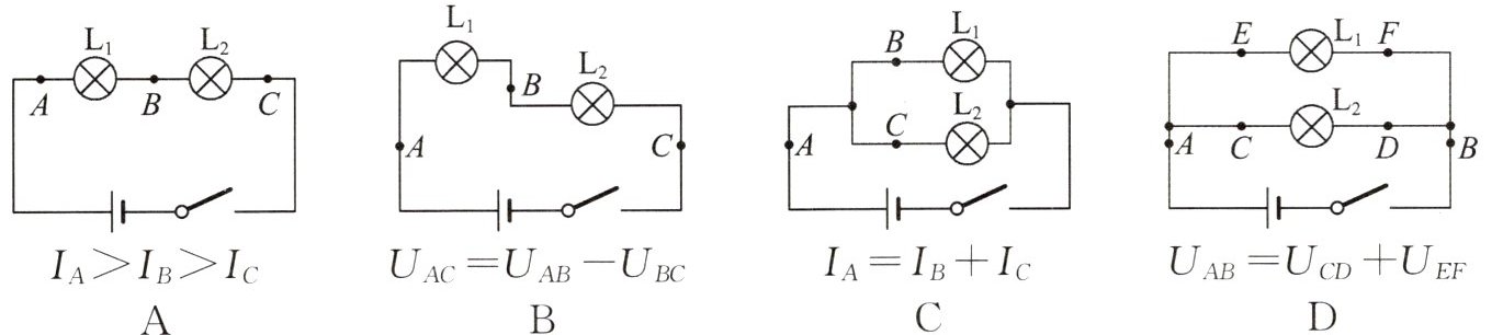 C 解析:A选项中,$L_{1}$和$L_{2}$串联,串联电路中各处的电流相等,则$I_{A}=I_{B}=I_{C}$,A错误;B选项中,$L_{1}$和$L_{2}$串联,串联电路两端的总电压等于各部分电路两端的电压之和,则$U_{AC}=U_{AB}+U_{BC}$,B错误;C选项中,$L_{1}$和$L_{2}$并联,并联电路中总电流等于各支路电流之和,则$I_{A}=I_{B}+I_{C}$,C正确;D选项中,$L_{1}$和$L_{2}$并联,并联电路两端的总电压等于各支路两端的电压,则$U_{AB}=U_{CD}=U_{EF}$,D错误.