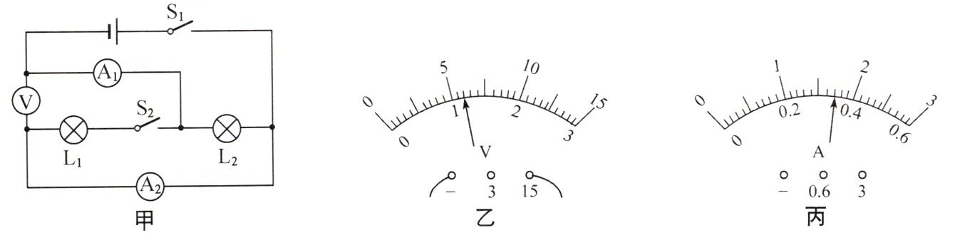 10. 如图甲所示,仅闭合开关$S_{1}$,电压表的示数如图乙所示;再闭合$S_{2}$,两个电流表的指针位置均如图丙所示.当$S_{1}$、$S_{2}$都闭合时,两灯______联,通过$L_{1}$的电流为______A,灯$L_{1}$两端的电压为______V;当仅闭合$S_{1}$时,电流表$A_{1}$的示数为______A.