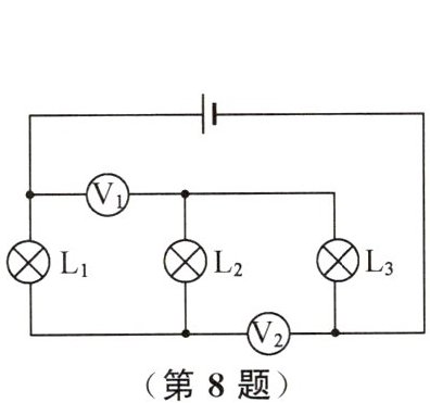 A 解析:由题图可知,电路中的电流只有一条路径,即从电源正极出发,经过灯泡$L_{1}$、$L_{2}$、$L_{3}$回到负极,故是串联电路,电压表$V_{2}$测量的是$L_{2}$和$L_{3}$两端的电压之和,电压表$V_{1}$测$L_{1}$和$L_{2}$两端电压之和,A错误,C正确;把题图中电压表换成电流表后,由于电流表相当于导线,所以三个灯泡处于三条支路中,即三个灯泡并联,B正确;通过每个灯泡的电流相同,若灯泡的规格相同,则每个灯泡两端的电压相同,故两个电压表的示数也一定相同,D正确.