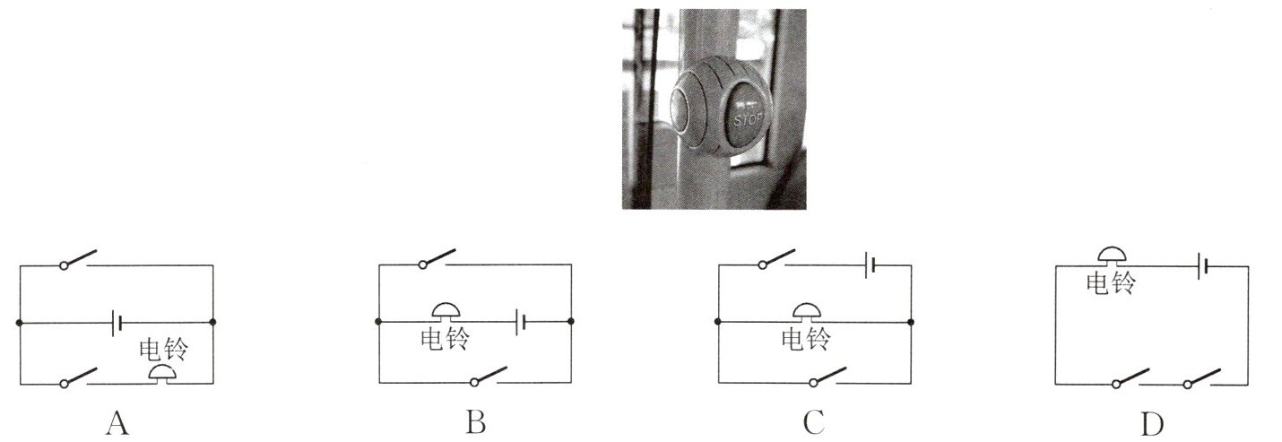 4. 自动售票公交车后门两侧的扶手上各装有一个红色按钮(如图所示),想要下车的乘客只要按下其中任一个按钮,装在车内的电铃就会发出声音,以提醒司机停车.下列电路图中符合要求的是 ()