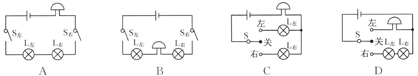 C 解析:解析:由题意可知,左、右转向灯独立工作,互不影响,是并联的;左、右转向灯中任何一个灯亮,蜂鸣器都会响,说明蜂鸣器接在干路上;可用一个单刀双掷开关控制支路上的转向灯,保证左、右转向灯不能同时亮,C符合题意.