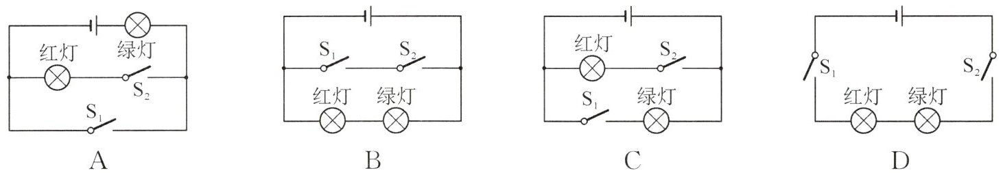 2. (2024·自贡)小布同学在经过十字路口时,观察了人行横道的交通信号灯,画出下列控制红、绿灯的电路图,你认为正确的是 ()