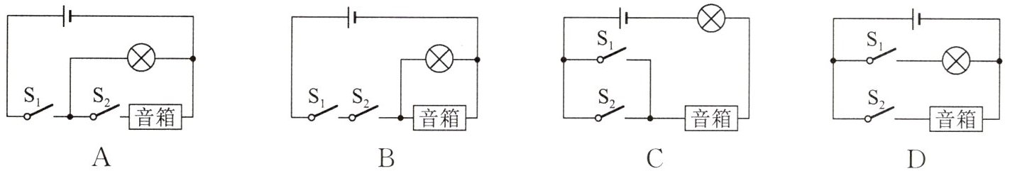 A 解析:当商品扫码时,开关$S_{1}$闭合,指示灯亮,这说明$S_{1}$能控制指示灯;付款成功时,开关$S_{2}$闭合,音箱提示支付成功,只闭合开关$S_{2}$,音箱不提示,这说明音响和指示灯能独立工作,是并联的,$S_{1}$在干路中,$S_{2}$在音箱所处的支路中.A正确.
