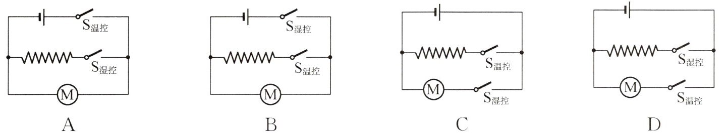6. (2024·常州)某款电子垃圾桶可以将湿的厨余垃圾变干,作为动物饲料.将湿的厨余垃圾倒入垃圾桶,电路检测到桶内垃圾潮湿时就会吹风.吹风过程中,当桶内温度低时,吹热风;当桶内温度高时,吹冷风,直至垃圾变干,整个电路结束工作.开关$S_{湿控}$在垃圾湿时闭合、干时断开;开关$S_{温控}$在桶内温度低($\leqslant 60^{\circ}C$)时闭合、温度高($>60^{\circ}C$)时断开.下列电路图中符合要求的是 ()