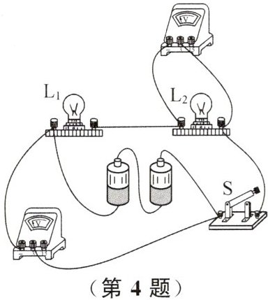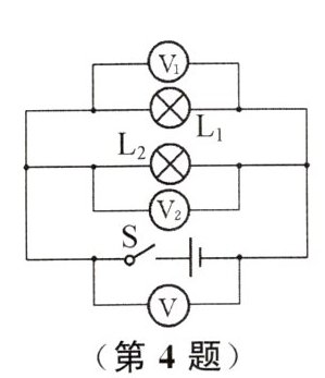 4. 在“探究串联电路电压特点”的实验中,小红按图正确连接好电路,闭合开关后发现两个电压表指针偏转角度相同。为寻找电路故障,小红用一根检测导线分别并联在灯$L_1$、$L_2$的两端,发现两个电压表指针所指位置均没有任何变化。由此可以推断()