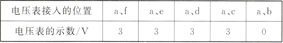 D 解析:由题意可知,电压表一侧接在接线柱a上,另一侧分别接在接线柱f、e、d、c时,电压表均有示数,则说明接线柱c到电源负极之间和接线柱a到电源正极之间电路完好、无故障;当另一侧接在接线柱b时,电压表示数为零,则说明bc段发生了断路,即连接接线柱b、c的导线断了.D符合题意.